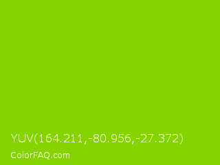 YUV 164.211,-80.956,-27.372 Color is a normal green color and the nearest color is Sheen Green #8fd400. Hex code #85d400 and RGB value is rgb(133,212,-0). In RGB color space, this color is composed of 52% red, 83% green, 0% blue, In CMYK color space, this color is composed of 37% cyan, 0% magenta, 100% yellow , 17% black , In HSL color space, this color has a hue angle of 82° , 100% saturation and 42% lightness.