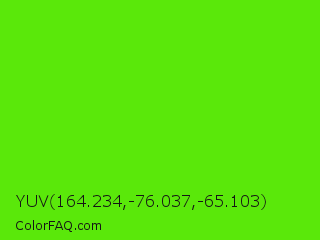 YUV 164.234,-76.037,-65.103 Color is a normal green color and the nearest color is Bright Green #66ff00. Hex code #5ae80a and RGB value is rgb(90,232,10). In RGB color space, this color is composed of 35% red, 91% green, 4% blue, In CMYK color space, this color is composed of 61% cyan, 0% magenta, 96% yellow , 9% black , In HSL color space, this color has a hue angle of 98° , 92% saturation and 47% lightness.