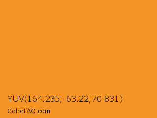YUV 164.235,-63.22,70.831 Color is a normal orange color and the nearest color is Carrot Orange #ed9121. Hex code #f59424 and RGB value is rgb(245,148,36). In RGB color space, this color is composed of 96% red, 58% green, 14% blue, In CMYK color space, this color is composed of 0% cyan, 40% magenta, 85% yellow , 4% black , In HSL color space, this color has a hue angle of 32° , 91% saturation and 55% lightness.