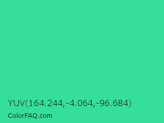 YUV 164.244,-4.064,-96.684 Color is a normal green color and the nearest color is Shamrock #33cc99. Hex code #36de9c and RGB value is rgb(54,222,156). In RGB color space, this color is composed of 21% red, 87% green, 61% blue, In CMYK color space, this color is composed of 76% cyan, 0% magenta, 30% yellow , 13% black , In HSL color space, this color has a hue angle of 156° , 72% saturation and 54% lightness.
