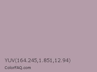 YUV 164.245,1.851,12.94 Color is a light rose color and the nearest color is Lilac Luster #ae98aa. Hex code #b39ca8 and RGB value is rgb(179,156,168). In RGB color space, this color is composed of 70% red, 61% green, 66% blue, In CMYK color space, this color is composed of 0% cyan, 13% magenta, 6% yellow , 30% black , In HSL color space, this color has a hue angle of 329° , 13% saturation and 66% lightness.