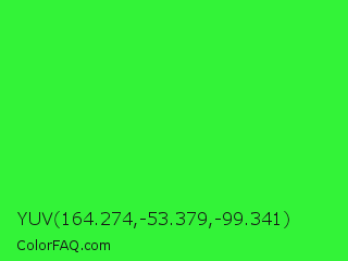 YUV 164.274,-53.379,-99.341 Color is a normal green color and the nearest color is Neon Green #39ff14. Hex code #33f338 and RGB value is rgb(51,243,56). In RGB color space, this color is composed of 20% red, 95% green, 22% blue, In CMYK color space, this color is composed of 79% cyan, 0% magenta, 77% yellow , 5% black , In HSL color space, this color has a hue angle of 122° , 89% saturation and 58% lightness.
