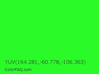 YUV 164.281,-60.778,-106.363 Color is a normal green color and the nearest color is Neon Green #39ff14. Hex code #2bfa29 and RGB value is rgb(43,250,41). In RGB color space, this color is composed of 17% red, 98% green, 16% blue, In CMYK color space, this color is composed of 83% cyan, 0% magenta, 84% yellow , 2% black , In HSL color space, this color has a hue angle of 119° , 95% saturation and 57% lightness.