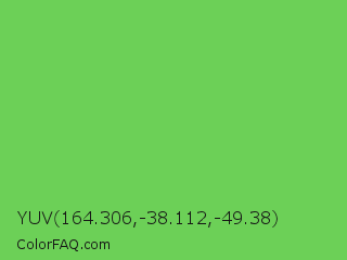 YUV 164.306,-38.112,-49.38 Color is a normal green color and the nearest color is Mantis #74c365. Hex code #6cd057 and RGB value is rgb(108,208,87). In RGB color space, this color is composed of 42% red, 82% green, 34% blue, In CMYK color space, this color is composed of 48% cyan, 0% magenta, 58% yellow , 18% black , In HSL color space, this color has a hue angle of 110° , 56% saturation and 58% lightness.