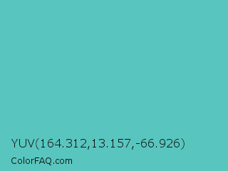 YUV 164.312,13.157,-66.926 Color is a normal cyan color and the nearest color is Fountain Blue #56b4be. Hex code #58c6bf and RGB value is rgb(88,198,191). In RGB color space, this color is composed of 35% red, 78% green, 75% blue, In CMYK color space, this color is composed of 56% cyan, 0% magenta, 4% yellow , 22% black , In HSL color space, this color has a hue angle of 176° , 49% saturation and 56% lightness.