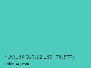 YUV 164.317,12.169,-76.577 Color is a normal cyan color and the nearest color is Medium Turquoise #48d1cc. Hex code #4dccbd and RGB value is rgb(77,204,189). In RGB color space, this color is composed of 30% red, 80% green, 74% blue, In CMYK color space, this color is composed of 62% cyan, 0% magenta, 7% yellow , 20% black , In HSL color space, this color has a hue angle of 173° , 55% saturation and 55% lightness.