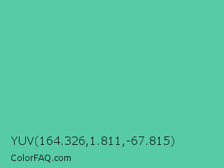 YUV 164.326,1.811,-67.815 Color is a normal green color and the nearest color is Eucalyptus #44d7a8. Hex code #57cba8 and RGB value is rgb(87,203,168). In RGB color space, this color is composed of 34% red, 80% green, 66% blue, In CMYK color space, this color is composed of 57% cyan, 0% magenta, 17% yellow , 20% black , In HSL color space, this color has a hue angle of 162° , 53% saturation and 57% lightness.