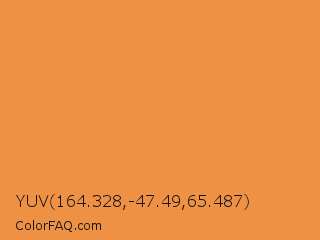 YUV 164.328,-47.49,65.487 Color is a normal orange color and the nearest color is Jaffa #ef863f. Hex code #ef9144 and RGB value is rgb(239,145,68). In RGB color space, this color is composed of 94% red, 57% green, 27% blue, In CMYK color space, this color is composed of 0% cyan, 39% magenta, 72% yellow , 6% black , In HSL color space, this color has a hue angle of 27° , 84% saturation and 60% lightness.