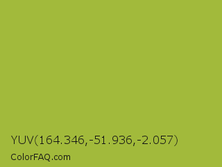YUV 164.346,-51.936,-2.057 Color is a normal lime color and the nearest color is Android Green #a4c639. Hex code #a2ba3b and RGB value is rgb(162,186,59). In RGB color space, this color is composed of 64% red, 73% green, 23% blue, In CMYK color space, this color is composed of 13% cyan, 0% magenta, 68% yellow , 27% black , In HSL color space, this color has a hue angle of 71° , 52% saturation and 48% lightness.