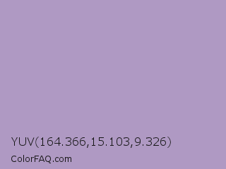 YUV 164.366,15.103,9.326 Color is a light purple color and the nearest color is East Side #ac91ce. Hex code #af99c3 and RGB value is rgb(175,153,195). In RGB color space, this color is composed of 69% red, 60% green, 76% blue, In CMYK color space, this color is composed of 10% cyan, 22% magenta, 0% yellow , 24% black , In HSL color space, this color has a hue angle of 271° , 26% saturation and 68% lightness.
