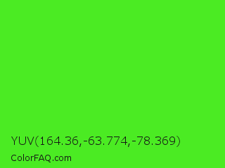 YUV 164.36,-63.774,-78.369 Color is a normal green color and the nearest color is Neon Green #39ff14. Hex code #4beb23 and RGB value is rgb(75,235,35). In RGB color space, this color is composed of 29% red, 92% green, 14% blue, In CMYK color space, this color is composed of 68% cyan, 0% magenta, 85% yellow , 8% black , In HSL color space, this color has a hue angle of 108° , 83% saturation and 53% lightness.