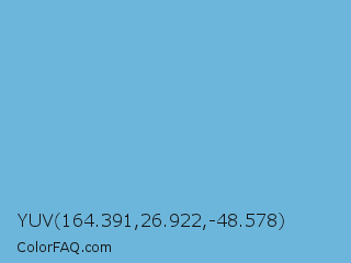 YUV 164.391,26.922,-48.578 Color is a light blue color and the nearest color is Iceberg #71a6d2. Hex code #6db6db and RGB value is rgb(109,182,219). In RGB color space, this color is composed of 43% red, 71% green, 86% blue, In CMYK color space, this color is composed of 50% cyan, 17% magenta, 0% yellow , 14% black , In HSL color space, this color has a hue angle of 200° , 60% saturation and 64% lightness.
