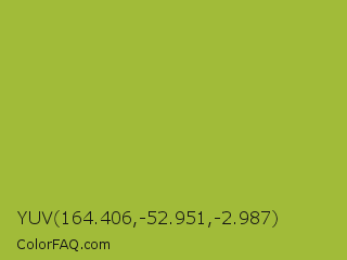 YUV 164.406,-52.951,-2.987 Color is a normal lime color and the nearest color is Android Green #a4c639. Hex code #a1bb39 and RGB value is rgb(161,187,57). In RGB color space, this color is composed of 63% red, 73% green, 22% blue, In CMYK color space, this color is composed of 14% cyan, 0% magenta, 70% yellow , 27% black , In HSL color space, this color has a hue angle of 72° , 53% saturation and 48% lightness.