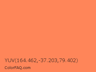 YUV 164.462,-37.203,79.402 Color is a light orange color and the nearest color is Coral #ff7f50. Hex code #ff8559 and RGB value is rgb(255,133,89). In RGB color space, this color is composed of 100% red, 52% green, 35% blue, In CMYK color space, this color is composed of 0% cyan, 48% magenta, 65% yellow , 0% black , In HSL color space, this color has a hue angle of 16° , 100% saturation and 67% lightness.
