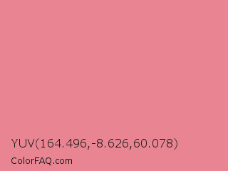 YUV 164.496,-8.626,60.078 Color is a light red color and the nearest color is Ruddy Pink #e18e96. Hex code #e98593 and RGB value is rgb(233,133,147). In RGB color space, this color is composed of 91% red, 52% green, 58% blue, In CMYK color space, this color is composed of 0% cyan, 43% magenta, 37% yellow , 9% black , In HSL color space, this color has a hue angle of 352° , 69% saturation and 72% lightness.
