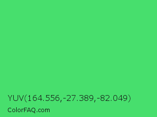 YUV 164.556,-27.389,-82.049 Color is a normal green color and the nearest color is UFO Green #3cd070. Hex code #47df6d and RGB value is rgb(71,223,109). In RGB color space, this color is composed of 28% red, 87% green, 43% blue, In CMYK color space, this color is composed of 68% cyan, 0% magenta, 51% yellow , 13% black , In HSL color space, this color has a hue angle of 135° , 70% saturation and 58% lightness.