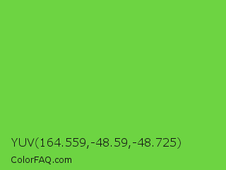 YUV 164.559,-48.59,-48.725 Color is a normal green color and the nearest color is Kiwi #8ee53f. Hex code #6dd442 and RGB value is rgb(109,212,66). In RGB color space, this color is composed of 43% red, 83% green, 26% blue, In CMYK color space, this color is composed of 49% cyan, 0% magenta, 69% yellow , 17% black , In HSL color space, this color has a hue angle of 102° , 63% saturation and 55% lightness.