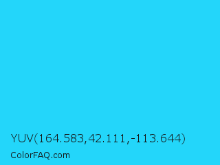 YUV 164.583,42.111,-113.644 Color is a normal cyan color and the nearest color is Spiro Disco Ball #0fc0fc. Hex code #23d6fa and RGB value is rgb(35,214,250). In RGB color space, this color is composed of 14% red, 84% green, 98% blue, In CMYK color space, this color is composed of 86% cyan, 14% magenta, 0% yellow , 2% black , In HSL color space, this color has a hue angle of 190° , 96% saturation and 56% lightness.
