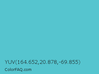 YUV 164.652,20.878,-69.855 Color is a normal cyan color and the nearest color is Sea Serpent #4bc7cf. Hex code #55c5cf and RGB value is rgb(85,197,207). In RGB color space, this color is composed of 33% red, 77% green, 81% blue, In CMYK color space, this color is composed of 59% cyan, 5% magenta, 0% yellow , 19% black , In HSL color space, this color has a hue angle of 185° , 56% saturation and 57% lightness.