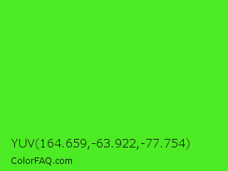 YUV 164.659,-63.922,-77.754 Color is a normal green color and the nearest color is Neon Green #39ff14. Hex code #4ceb23 and RGB value is rgb(76,235,35). In RGB color space, this color is composed of 30% red, 92% green, 14% blue, In CMYK color space, this color is composed of 68% cyan, 0% magenta, 85% yellow , 8% black , In HSL color space, this color has a hue angle of 108° , 83% saturation and 53% lightness.