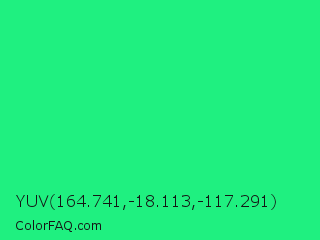 YUV 164.741,-18.113,-117.291 Color is a normal green color and the nearest color is Spring Green #00ff7f. Hex code #1ff080 and RGB value is rgb(31,240,128). In RGB color space, this color is composed of 12% red, 94% green, 50% blue, In CMYK color space, this color is composed of 87% cyan, 0% magenta, 47% yellow , 6% black , In HSL color space, this color has a hue angle of 148° , 87% saturation and 53% lightness.