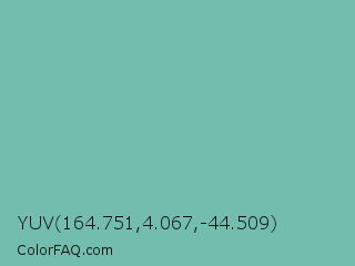 YUV 164.751,4.067,-44.509 Color is a normal cyan color and the nearest color is Gulf Stream #80b3ae. Hex code #72bdad and RGB value is rgb(114,189,173). In RGB color space, this color is composed of 45% red, 74% green, 68% blue, In CMYK color space, this color is composed of 40% cyan, 0% magenta, 8% yellow , 26% black , In HSL color space, this color has a hue angle of 167° , 36% saturation and 59% lightness.