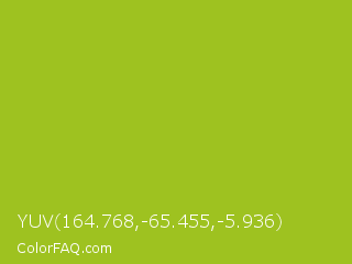 YUV 164.768,-65.455,-5.936 Color is a normal lime color and the nearest color is Atlantis #97cd2d. Hex code #9ec220 and RGB value is rgb(158,194,32). In RGB color space, this color is composed of 62% red, 76% green, 13% blue, In CMYK color space, this color is composed of 19% cyan, 0% magenta, 84% yellow , 24% black , In HSL color space, this color has a hue angle of 73° , 72% saturation and 44% lightness.