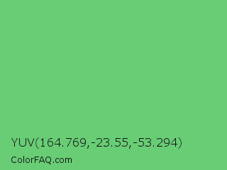 YUV 164.769,-23.55,-53.294 Color is a light green color and the nearest color is Iguana Green #71bc78. Hex code #68cd75 and RGB value is rgb(104,205,117). In RGB color space, this color is composed of 41% red, 80% green, 46% blue, In CMYK color space, this color is composed of 49% cyan, 0% magenta, 43% yellow , 20% black , In HSL color space, this color has a hue angle of 128° , 50% saturation and 61% lightness.