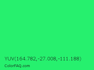 YUV 164.782,-27.008,-111.188 Color is a normal green color and the nearest color is UFO Green #3cd070. Hex code #26f06e and RGB value is rgb(38,240,110). In RGB color space, this color is composed of 15% red, 94% green, 43% blue, In CMYK color space, this color is composed of 84% cyan, 0% magenta, 54% yellow , 6% black , In HSL color space, this color has a hue angle of 141° , 87% saturation and 55% lightness.