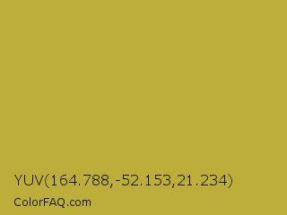 YUV 164.788,-52.153,21.234 Color is a normal yellow color and the nearest color is Brass #b5a642. Hex code #bdad3b and RGB value is rgb(189,173,59). In RGB color space, this color is composed of 74% red, 68% green, 23% blue, In CMYK color space, this color is composed of 0% cyan, 8% magenta, 69% yellow , 26% black , In HSL color space, this color has a hue angle of 53° , 52% saturation and 49% lightness.