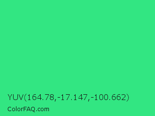 YUV 164.78,-17.147,-100.662 Color is a normal green color and the nearest color is UFO Green #3cd070. Hex code #32e682 and RGB value is rgb(50,230,130). In RGB color space, this color is composed of 20% red, 90% green, 51% blue, In CMYK color space, this color is composed of 78% cyan, 0% magenta, 43% yellow , 10% black , In HSL color space, this color has a hue angle of 147° , 78% saturation and 55% lightness.