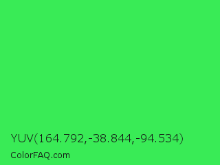 YUV 164.792,-38.844,-94.534 Color is a normal green color and the nearest color is UFO Green #3cd070. Hex code #39eb56 and RGB value is rgb(57,235,86). In RGB color space, this color is composed of 22% red, 92% green, 34% blue, In CMYK color space, this color is composed of 76% cyan, 0% magenta, 63% yellow , 8% black , In HSL color space, this color has a hue angle of 130° , 82% saturation and 57% lightness.