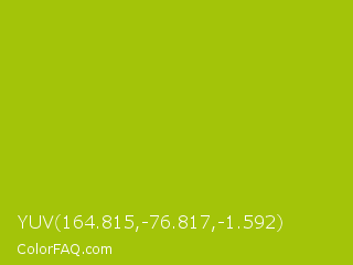 YUV 164.815,-76.817,-1.592 Color is a normal lime color and the nearest color is Citrus #a1c50a. Hex code #a3c409 and RGB value is rgb(163,196,9). In RGB color space, this color is composed of 64% red, 77% green, 4% blue, In CMYK color space, this color is composed of 17% cyan, 0% magenta, 95% yellow , 23% black , In HSL color space, this color has a hue angle of 71° , 91% saturation and 40% lightness.