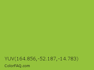 YUV 164.856,-52.187,-14.783 Color is a normal green color and the nearest color is Yellow Green #9acd32. Hex code #94c23b and RGB value is rgb(148,194,59). In RGB color space, this color is composed of 58% red, 76% green, 23% blue, In CMYK color space, this color is composed of 24% cyan, 0% magenta, 70% yellow , 24% black , In HSL color space, this color has a hue angle of 80° , 53% saturation and 50% lightness.