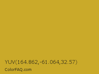 YUV 164.862,-61.064,32.57 Color is a normal yellow color and the nearest color is Hokey Pokey #c8a528. Hex code #caaa29 and RGB value is rgb(202,170,41). In RGB color space, this color is composed of 79% red, 67% green, 16% blue, In CMYK color space, this color is composed of 0% cyan, 16% magenta, 80% yellow , 21% black , In HSL color space, this color has a hue angle of 48° , 66% saturation and 48% lightness.