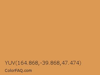 YUV 164.868,-39.868,47.474 Color is a normal orange color and the nearest color is Di Serria #db995e. Hex code #db9954 and RGB value is rgb(219,153,84). In RGB color space, this color is composed of 86% red, 60% green, 33% blue, In CMYK color space, this color is composed of 0% cyan, 30% magenta, 62% yellow , 14% black , In HSL color space, this color has a hue angle of 31° , 65% saturation and 59% lightness.