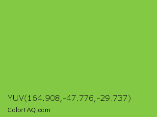 YUV 164.908,-47.776,-29.737 Color is a normal green color and the nearest color is Yellow Green #9acd32. Hex code #83c944 and RGB value is rgb(131,201,68). In RGB color space, this color is composed of 51% red, 79% green, 27% blue, In CMYK color space, this color is composed of 35% cyan, 0% magenta, 66% yellow , 21% black , In HSL color space, this color has a hue angle of 92° , 55% saturation and 53% lightness.