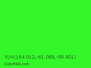 YUV 164.912,-61.089,-99.901 Color is a normal green color and the nearest color is Neon Green #39ff14. Hex code #33f729 and RGB value is rgb(51,247,41). In RGB color space, this color is composed of 20% red, 97% green, 16% blue, In CMYK color space, this color is composed of 79% cyan, 0% magenta, 83% yellow , 3% black , In HSL color space, this color has a hue angle of 117° , 93% saturation and 56% lightness.