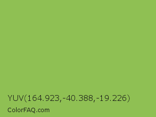YUV 164.923,-40.388,-19.226 Color is a normal green color and the nearest color is Dollar Bill #85bb65. Hex code #8fc053 and RGB value is rgb(143,192,83). In RGB color space, this color is composed of 56% red, 75% green, 33% blue, In CMYK color space, this color is composed of 26% cyan, 0% magenta, 57% yellow , 25% black , In HSL color space, this color has a hue angle of 87° , 46% saturation and 54% lightness.