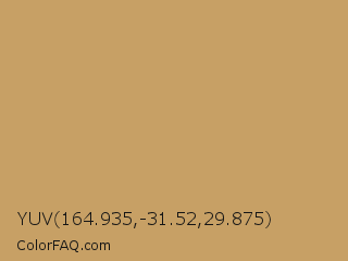 YUV 164.935,-31.52,29.875 Color is a normal orange color and the nearest color is Brown Yellow #cc9966. Hex code #c7a065 and RGB value is rgb(199,160,101). In RGB color space, this color is composed of 78% red, 63% green, 40% blue, In CMYK color space, this color is composed of 0% cyan, 20% magenta, 49% yellow , 22% black , In HSL color space, this color has a hue angle of 36° , 47% saturation and 59% lightness.