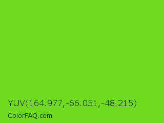 YUV 164.977,-66.051,-48.215 Color is a normal green color and the nearest color is Lima #76bd17. Hex code #6edb1f and RGB value is rgb(110,219,31). In RGB color space, this color is composed of 43% red, 86% green, 12% blue, In CMYK color space, this color is composed of 50% cyan, 0% magenta, 86% yellow , 14% black , In HSL color space, this color has a hue angle of 95° , 75% saturation and 49% lightness.