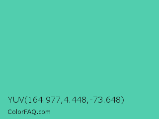 YUV 164.977,4.448,-73.648 Color is a normal cyan color and the nearest color is Eucalyptus #44d7a8. Hex code #51ceae and RGB value is rgb(81,206,174). In RGB color space, this color is composed of 32% red, 81% green, 68% blue, In CMYK color space, this color is composed of 61% cyan, 0% magenta, 16% yellow , 19% black , In HSL color space, this color has a hue angle of 165° , 56% saturation and 56% lightness.