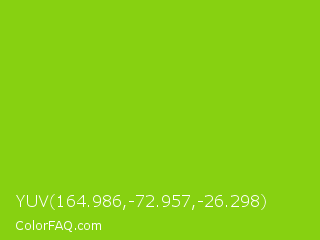 YUV 164.986,-72.957,-26.298 Color is a normal green color and the nearest color is Sheen Green #8fd400. Hex code #87d111 and RGB value is rgb(135,209,17). In RGB color space, this color is composed of 53% red, 82% green, 7% blue, In CMYK color space, this color is composed of 35% cyan, 0% magenta, 92% yellow , 18% black , In HSL color space, this color has a hue angle of 83° , 85% saturation and 44% lightness.
