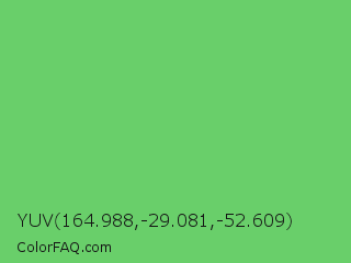 YUV 164.988,-29.081,-52.609 Color is a light green color and the nearest color is Mantis #74c365. Hex code #69cf6a and RGB value is rgb(105,207,106). In RGB color space, this color is composed of 41% red, 81% green, 42% blue, In CMYK color space, this color is composed of 49% cyan, 0% magenta, 49% yellow , 19% black , In HSL color space, this color has a hue angle of 121° , 52% saturation and 61% lightness.