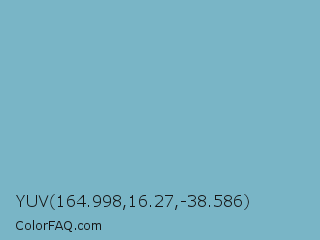 YUV 164.998,16.27,-38.586 Color is a light cyan color and the nearest color is Glacier #80b3c4. Hex code #79b5c6 and RGB value is rgb(121,181,198). In RGB color space, this color is composed of 47% red, 71% green, 78% blue, In CMYK color space, this color is composed of 39% cyan, 9% magenta, 0% yellow , 22% black , In HSL color space, this color has a hue angle of 193° , 40% saturation and 63% lightness.