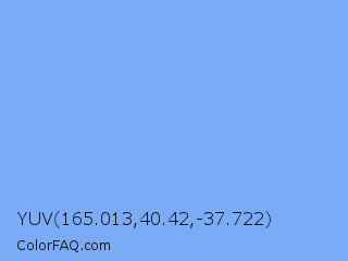 YUV 165.013,40.42,-37.722 Color is a light blue color and the nearest color is French Sky Blue #77b5fe. Hex code #7aabf7 and RGB value is rgb(122,171,247). In RGB color space, this color is composed of 48% red, 67% green, 97% blue, In CMYK color space, this color is composed of 51% cyan, 31% magenta, 0% yellow , 3% black , In HSL color space, this color has a hue angle of 216° , 89% saturation and 72% lightness.