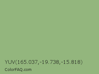 YUV 165.037,-19.738,-15.818 Color is a normal green color and the nearest color is Olivine #9ab973. Hex code #93b67d and RGB value is rgb(147,182,125). In RGB color space, this color is composed of 58% red, 71% green, 49% blue, In CMYK color space, this color is composed of 19% cyan, 0% magenta, 31% yellow , 29% black , In HSL color space, this color has a hue angle of 97° , 28% saturation and 60% lightness.
