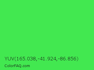 YUV 165.038,-41.924,-86.856 Color is a normal green color and the nearest color is UFO Green #3cd070. Hex code #42e850 and RGB value is rgb(66,232,80). In RGB color space, this color is composed of 26% red, 91% green, 31% blue, In CMYK color space, this color is composed of 72% cyan, 0% magenta, 66% yellow , 9% black , In HSL color space, this color has a hue angle of 125° , 78% saturation and 58% lightness.