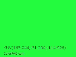 YUV 165.044,-51.294,-114.926 Color is a normal green color and the nearest color is Malachite #0bda51. Hex code #22fc3d and RGB value is rgb(34,252,61). In RGB color space, this color is composed of 13% red, 99% green, 24% blue, In CMYK color space, this color is composed of 87% cyan, 0% magenta, 76% yellow , 1% black , In HSL color space, this color has a hue angle of 127° , 97% saturation and 56% lightness.