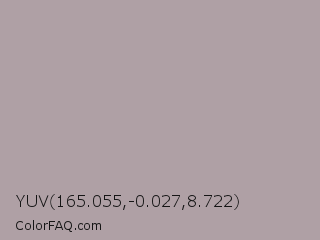 YUV 165.055,-0.027,8.722 Color is a light rose color and the nearest color is Martini #afa09e. Hex code #afa0a5 and RGB value is rgb(175,160,165). In RGB color space, this color is composed of 69% red, 63% green, 65% blue, In CMYK color space, this color is composed of 0% cyan, 9% magenta, 6% yellow , 31% black , In HSL color space, this color has a hue angle of 340° , 9% saturation and 66% lightness.